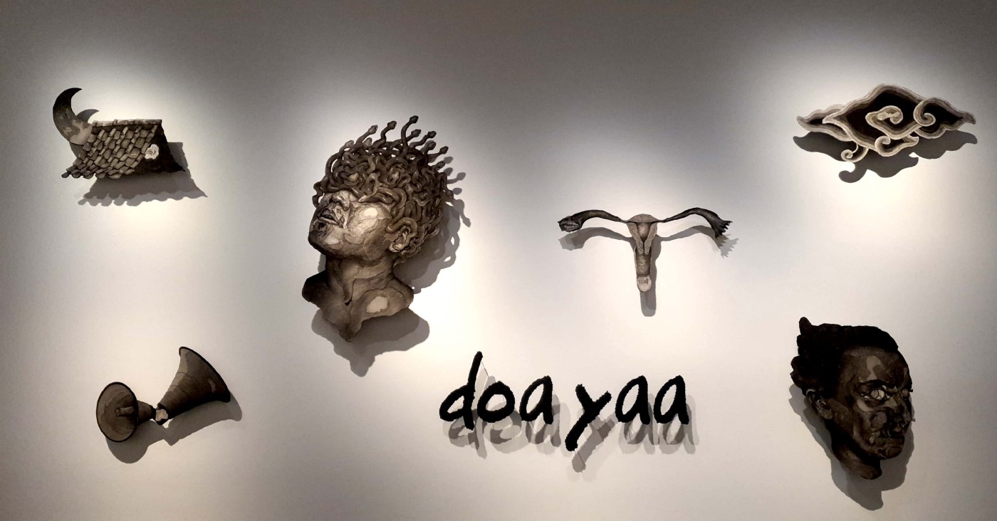 As described in her works, the installation described the intense her life as a young couple in Yogyakarta, Indonesia. The symbol used to highlight the location is the use of the Mega Mendung cloud, a visual motif used in batik, which is the common visual element used in Batik, a wax-resist dyeing method. The other symbols such as loud hailers and cross-section of the ears suggest people’s impertinence and suggest broadcast — perhaps alluding to broadcasting news or gossip. Finally, the uterus and the woman in the shadows suggest that women reproduction has always been a topic of conversation.