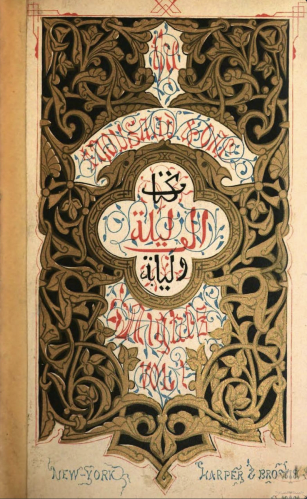 Ornamented page from Edward Lane’s The Thousand and One Nights translation. From The Thousand and One Nights by Edward William Lane, Harper & Brothers, 1848. Source: https://play.google.com/books/reader?id=yCIYAAAAYAAJ&pg=GBS.PP6
